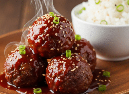 Tender, caramelized meatballs, glistening with a sticky-sweet and subtly spicy gochujang glaze. One bite delivers an explosion of savory, garlicky,