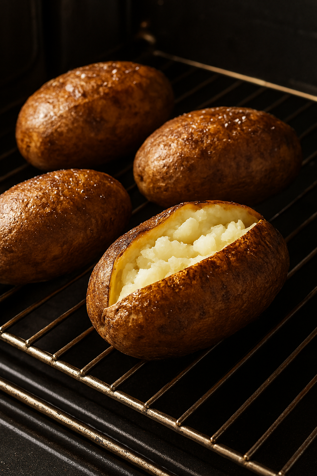 Place the potatoes directly on the oven rack. This allows hot air to circulate around them, ensuring even cooking. Bake for 45–60 minutes, depending on size.